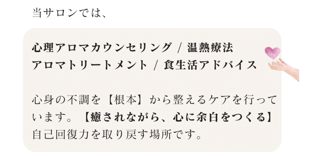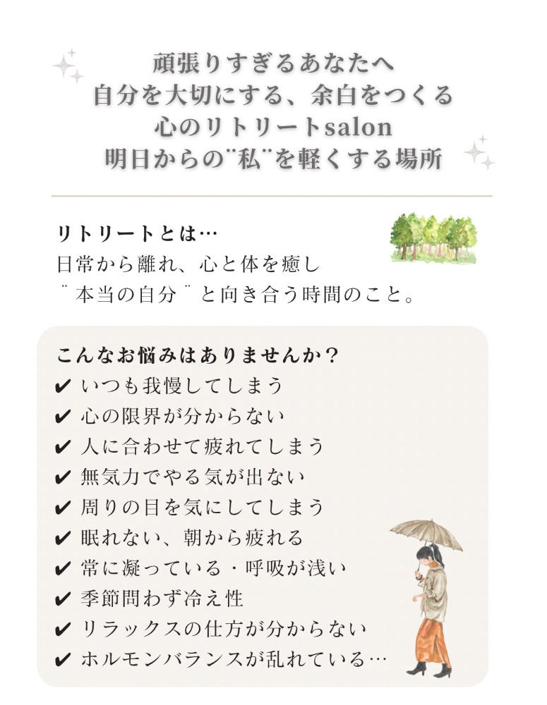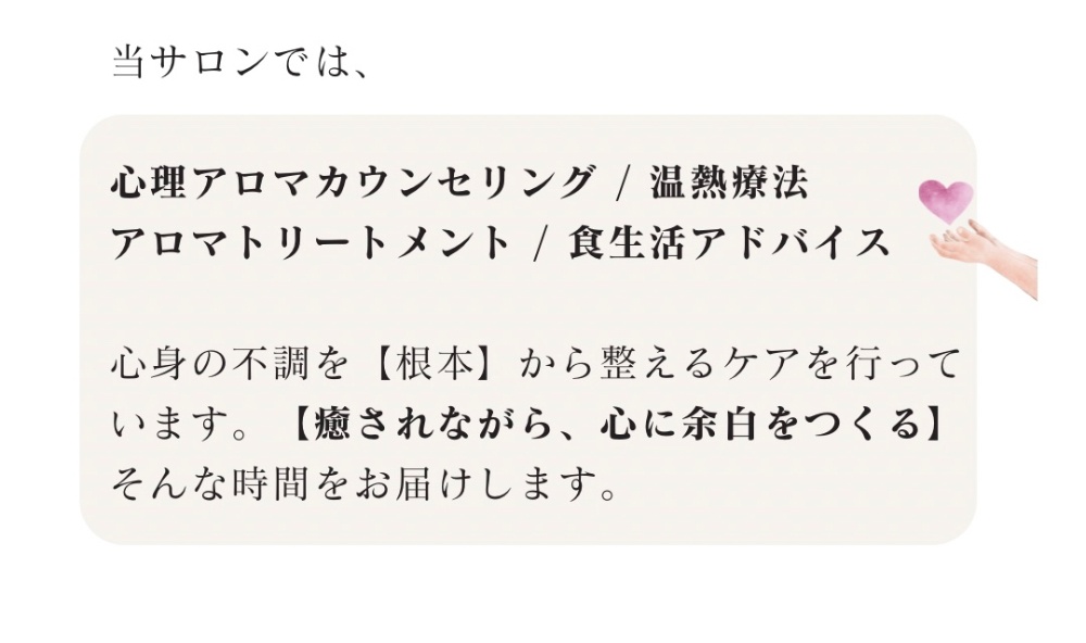 | その他 | ・駐車場3台 ・女性専用 ・お子様連れ可 ・妊婦様対応可 |